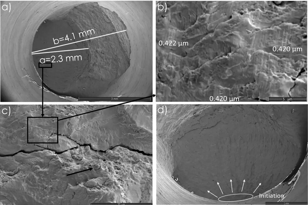 图3 250 MPa载荷试样在5.88×108次循环下失效的典型疲劳断口表面:(a) 断口表面整体以及裂纹长度;(b) 疲劳辉纹及其尺寸;(c) 表面裂纹和疲劳辉纹的位置;(d) 裂纹萌生区域和扩展区