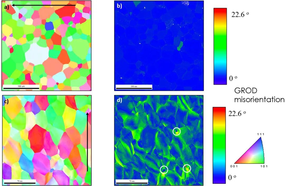 图4 (a) 初始C103微观结构EBSD图像;(b) 为初始的晶粒参考取向差图;(c) 为疲劳后微观结构EBSD图像;(d) 为相应的晶粒参考取向偏差图(箭头表示加载方向)
