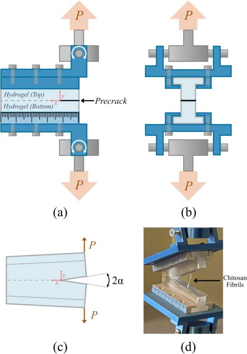 (1)设计并制备了具有T形横截面的淀粉增强聚丙烯酰胺水凝胶基体。通过在不同分子量(1.5, 15, 120, 250, 343 kDa)和不同pH值(2.5, 3.5, 4.5)的壳聚糖溶液作用下,将两个T形基体粘接,形成用于界面断裂测试的试样。针对水凝胶质软、易变形的特点,研究团队自主设计了轻质、高刚度的3D打印测试夹具,分别用于实现纯张开(I型)和拉-弯组合(混合型)的加载条件,成功避免了传统方法中因基体过大变形带来的测量误差(图1、图2)。