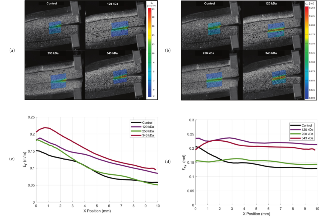 图5 裂纹萌生时(a)正应变与(b)剪切应变分布沿界面在混合模式下的分布情况,适用于对照组及在裂尖处施加不同分子量壳聚糖溶液的试样;不同分子量壳聚糖在裂纹萌生阶段承受混合模式载荷时的(c)正应变分布和(d)剪切应变分布