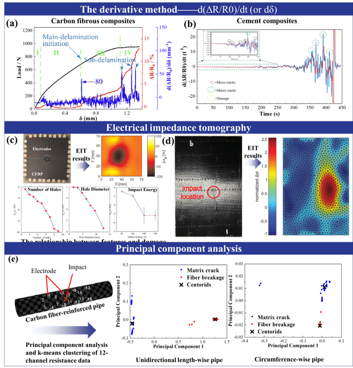 2)准确的损伤特征提取:通过信号提取来建立电学特征与结构损伤之间可靠的定性关系是压阻式SHM的核心。本文系统的归纳了基于电阻和基于阻抗的方法。基于电阻的方法主要包括①电阻相对变化率 (FCR),最主流的方法,用于表征裂纹萌生、多阶段损伤演化及冲击事件;②电阻突变/导数分析,利用信号的突变峰值或一阶导数峰值来识别裂纹的瞬时起裂;③机器学习算法 (如PCA),通过复杂信号处理对不同损伤模式(如基体或纤维断裂)进行聚类和识别;④电阻抗断层成像 (EIT),从电极阵列中提取电学特征实现损伤位置和形态的重构。