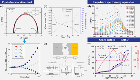 基于阻抗的方法主要包括①等效电路法,通过拟合阻抗谱将损伤解耦为电路元件的变化,不仅提供更丰富的多维损伤信息,同时也能阐明结构损伤与电学特征之间的物理意义;②阻抗谱分离,通过分析不同频率下的阻抗变化(EZV)或统计指标表征渐进式损伤过程。目前基于阻抗的方法更多用于水泥基复合材料中,在聚合物材料中的研究是有待开拓的方向.