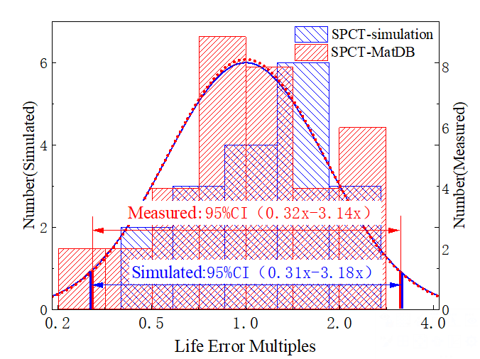 图4将模拟得到的寿命误差分布与欧盟联合研究中心(JRC)MatDB数据库中的实验数据进行了对比。结果显示,模拟预测的95%置信区间(0.31倍-3.18倍寿命)与实验测量值(0.32倍-3.14倍寿命)高度吻合,验证了模型的有效性。