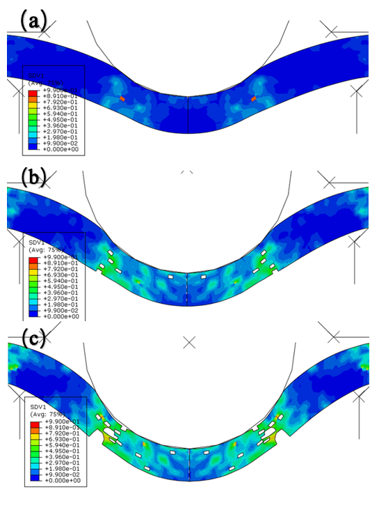 图5展示了SPCT试样在蠕变不同阶段的损伤云图演化。由于引入了概率分布,损伤增长在截面上呈现非均匀性,复现了局部延性耗竭导致微裂纹形成的物理过程。