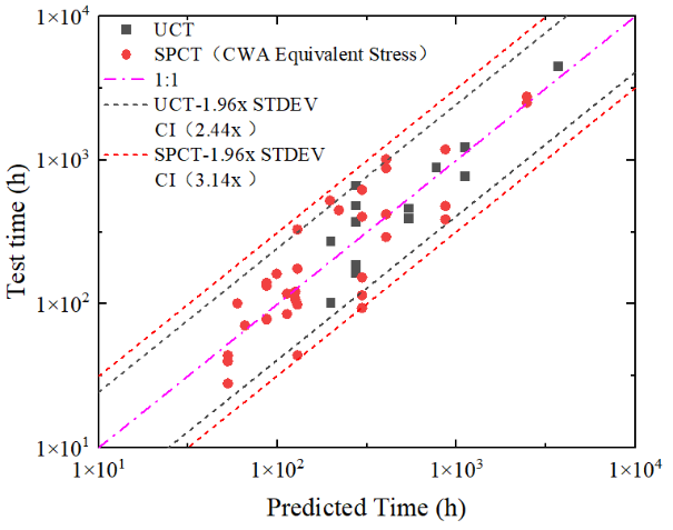 (4)SPCT与UCT数据分散性的统计学差异:研究进一步对比了SPCT和UCT两种测试方法的寿命分散性。图6在双对数坐标下对比了MatDB数据库中SPCT和UCT的断裂时间分布,直观显示了SPCT数据点具有更大的离散带宽。