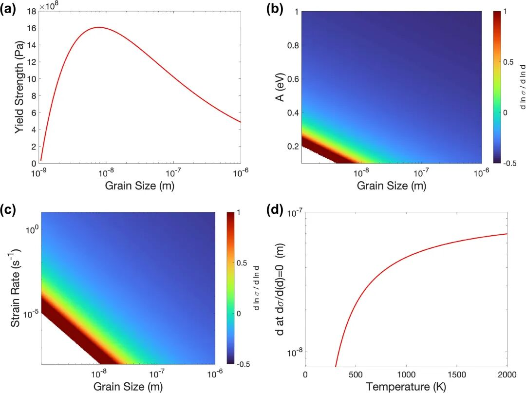 图1 该框架理论计算结果:(a)材料的Hall-Petch响应,其中以及在300 K时显示出反Hall-Petch响应;(b)Hall-Petch 斜率随晶粒尺寸与应变速率变化的关系图;(c) Hall-Petch 斜率随晶粒尺寸与激活自由能 A 变化的关系图;(d)温度对Hall-Petch斜率零点的影响。