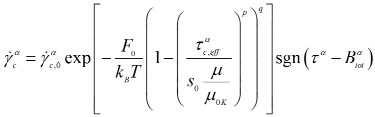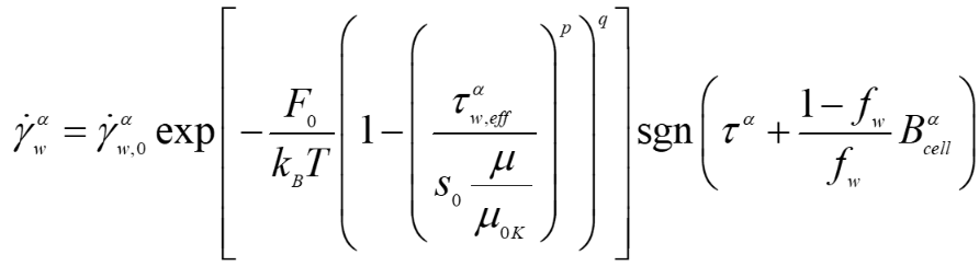 其中,γαc,0和γαw,0分别为胞内区域与胞壁区域的参考剪切速率,kB为玻尔兹曼常数,T为绝对温度,μ为剪切模量μ0K为0 K时的剪切模量,p和q为形貌特征参数,F0为克服短程位错障碍所需的激活能,s0为0 K时的热滑移阻力。