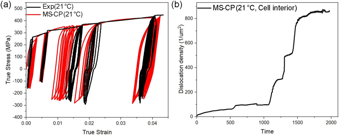 图 1 (a) A600合金在21°C下棘轮响应的试验与模拟结果对比;(b) 模拟所得的胞内区域总位错密度随加载时间的演化规律