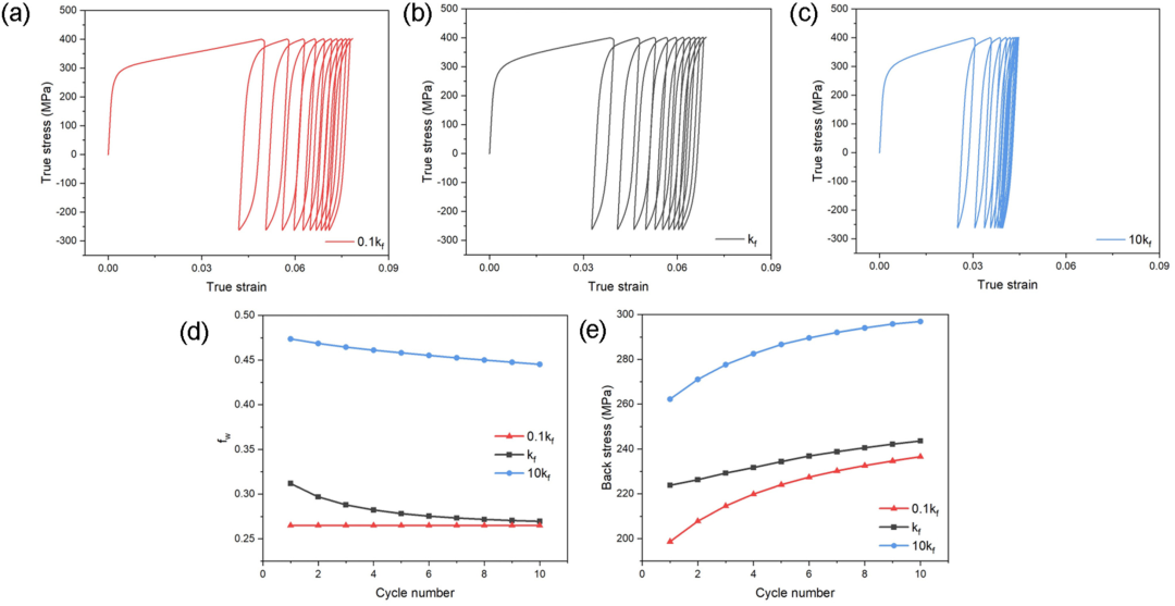 图2(a-c)展示了在0.1 kf、kf和10 kf参数下的单相棘轮响应:棘轮应变与棘轮速率均随kf增大而显著降低。如图2d所示,最大kf值通过产生最高的运动硬化速率,进而使棘轮应变最小。对应的背应力演化如图2e所示,较高的kf始终导致更大的背应力。值得注意的是,在0.1 kf工况下,尽管fw在首个循环后即饱和,背应力仍持续演化,这表明背应力的稳定状态主要受纵横比主导,而非fw。
