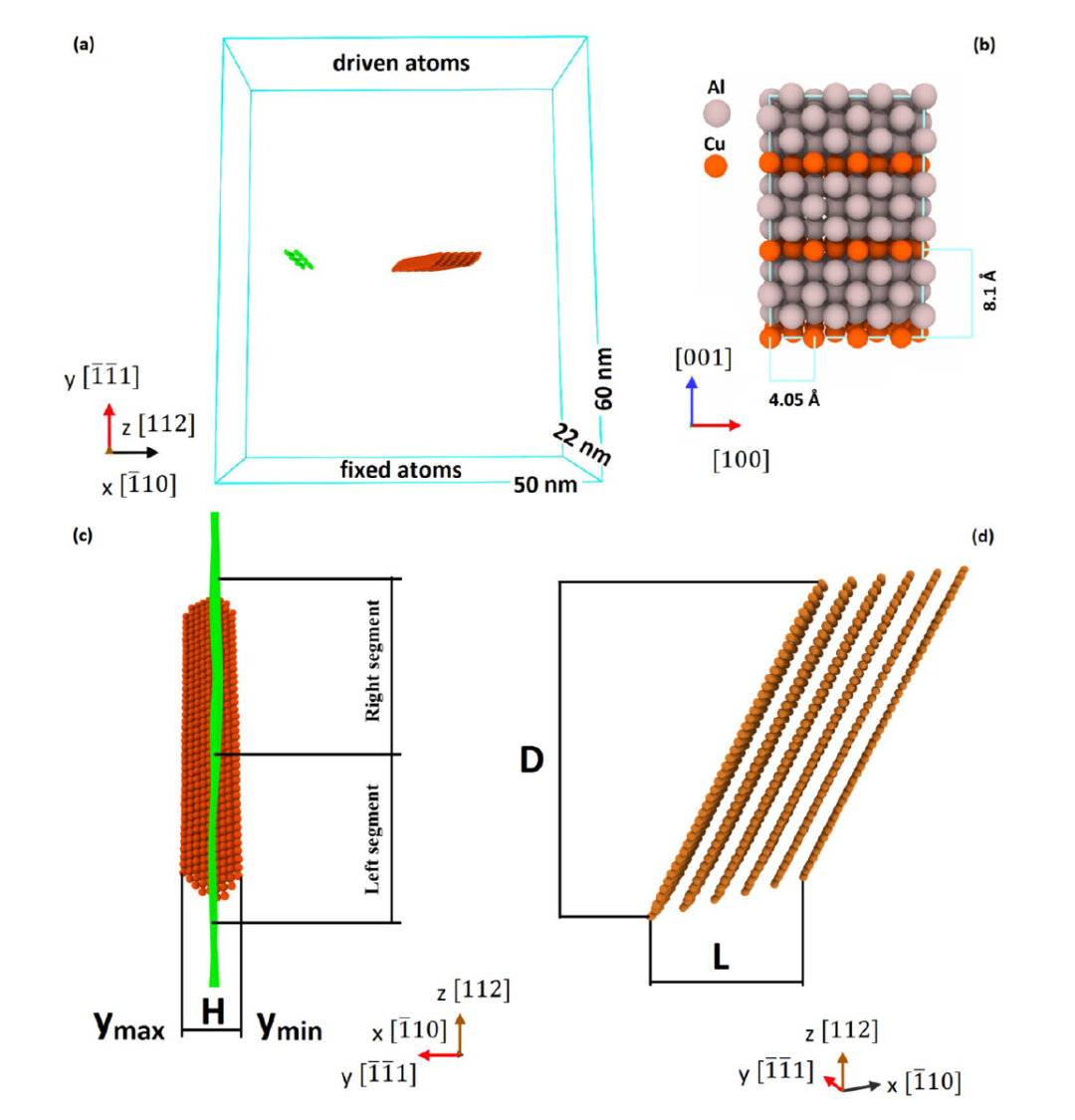 图1 (a)含两条分位错(绿线)和六层θ''析出相(铜原子为橙色点)的初始体系;(b)θ''相晶体结构;(c,d)析出相几何参数D、L和H的示意图