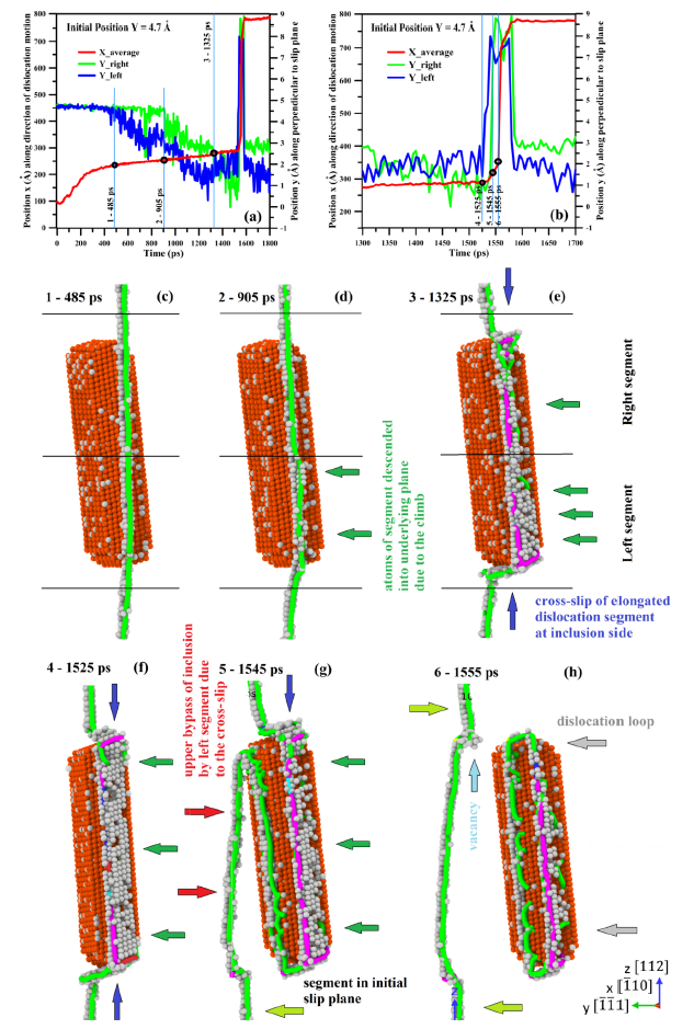 (3)当初始滑移面位于析出相中心以下时,位错通过前表面攀移从下方绕过析出相(图3)。位错与析出相接触后,前表面的分位错发生一系列复杂反应,形成Frank位错段,这是涉及体积重分布的非保守运动的直接原子尺度证据,说明攀移过程中有空位的局域产生或湮没。析出相/基体界面作为点缺陷的高效局域源,使攀移无需长程扩散即可在高应变率下发生。