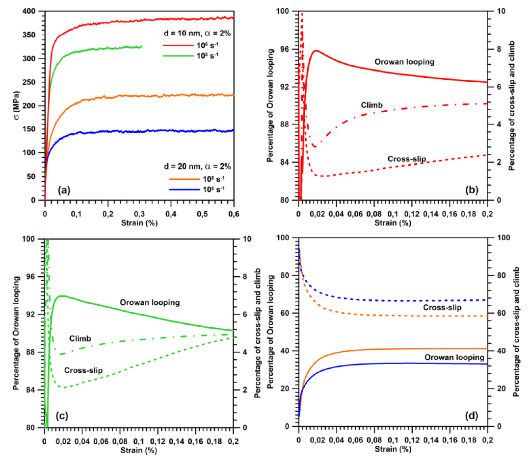 图5 2D DDD分析结果:(a)不同析出相尺寸和应变率下的应力-应变曲线;(b-d)不同条件下各机制百分比随应变的演化
