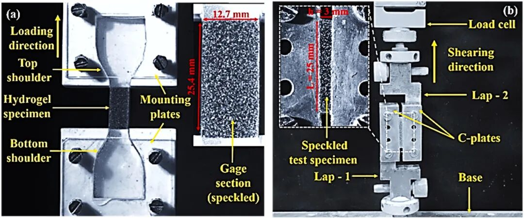 图2 (a)单轴拉伸(插图为斑点试样)、(b)简单剪切实验(插图为斑点试样)的实验装置