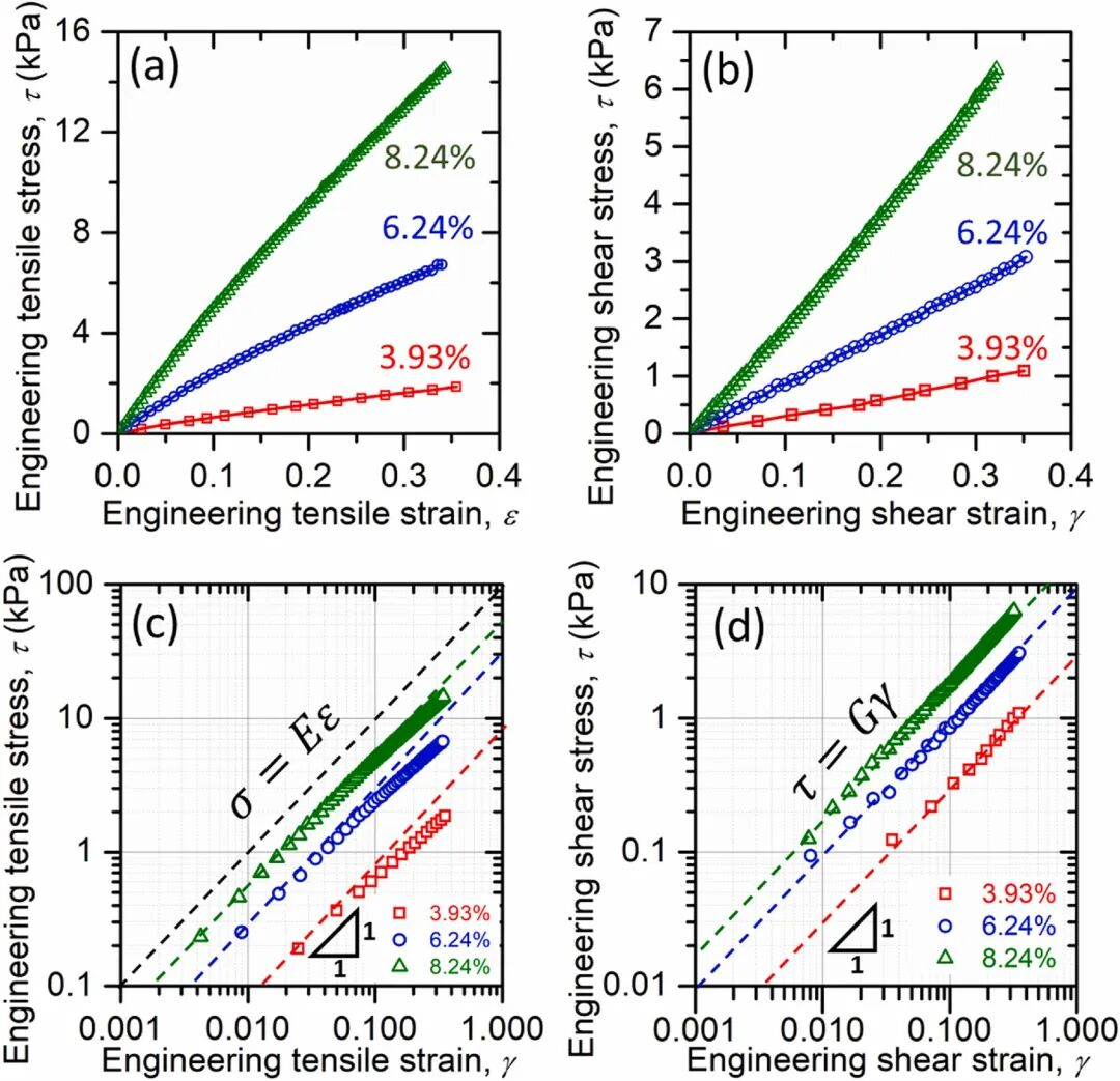 Pal S, Angelini T E, Bhattacharyya A. Elastic moduli and strain-dependent lateral strain to axial strain ratio in semi-dilute polyacrylamide hydrogels[J]. Journal of the Mechanical Behavior of Biomedical Materials, 2025: 107244.