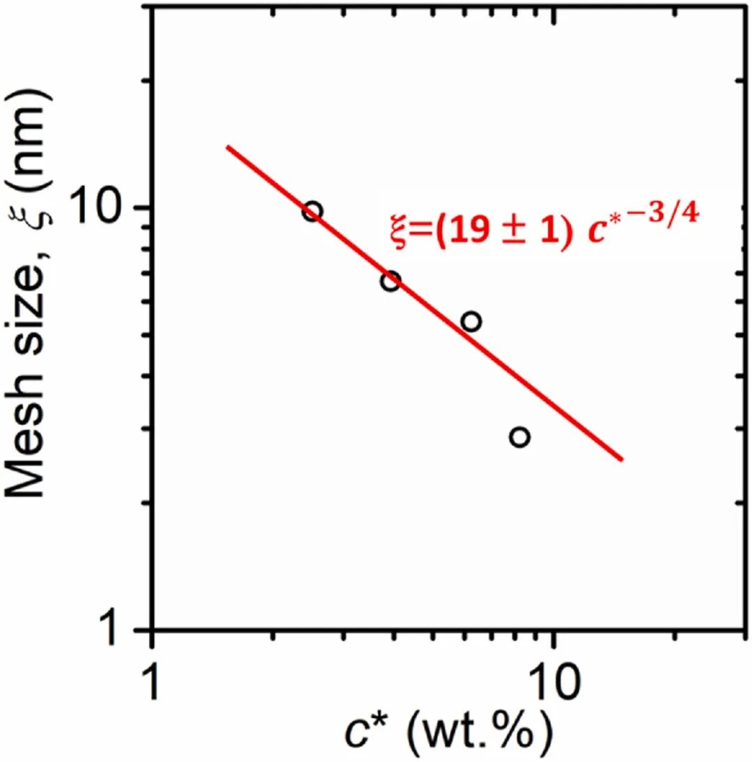 图4 网格尺寸ξ与相对浓度c*之间的缩放关系,显示幂律关系ξ~c*-0.75