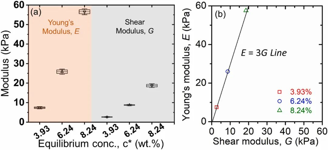 图5 (a) 杨氏模量(E)和剪切模量(G)随平衡溶胀水凝胶浓度(c*)的变化; (b) 不同水凝胶组成下E与G的变化表明,在平衡溶胀水凝胶中,E/G接近3