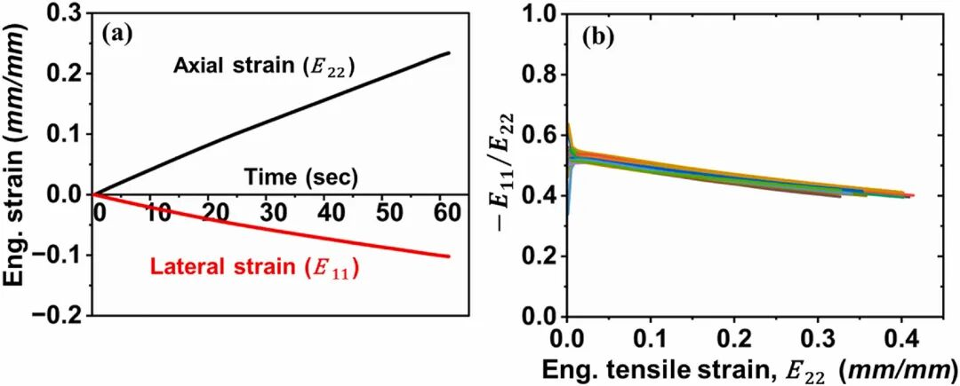 图6 (a)c*=64wt%时,轴向应变和横向应变随时间的变化;(b)横向应变与轴向应变之比随工程拉伸应变的变化,与浓度和应变速率无关。