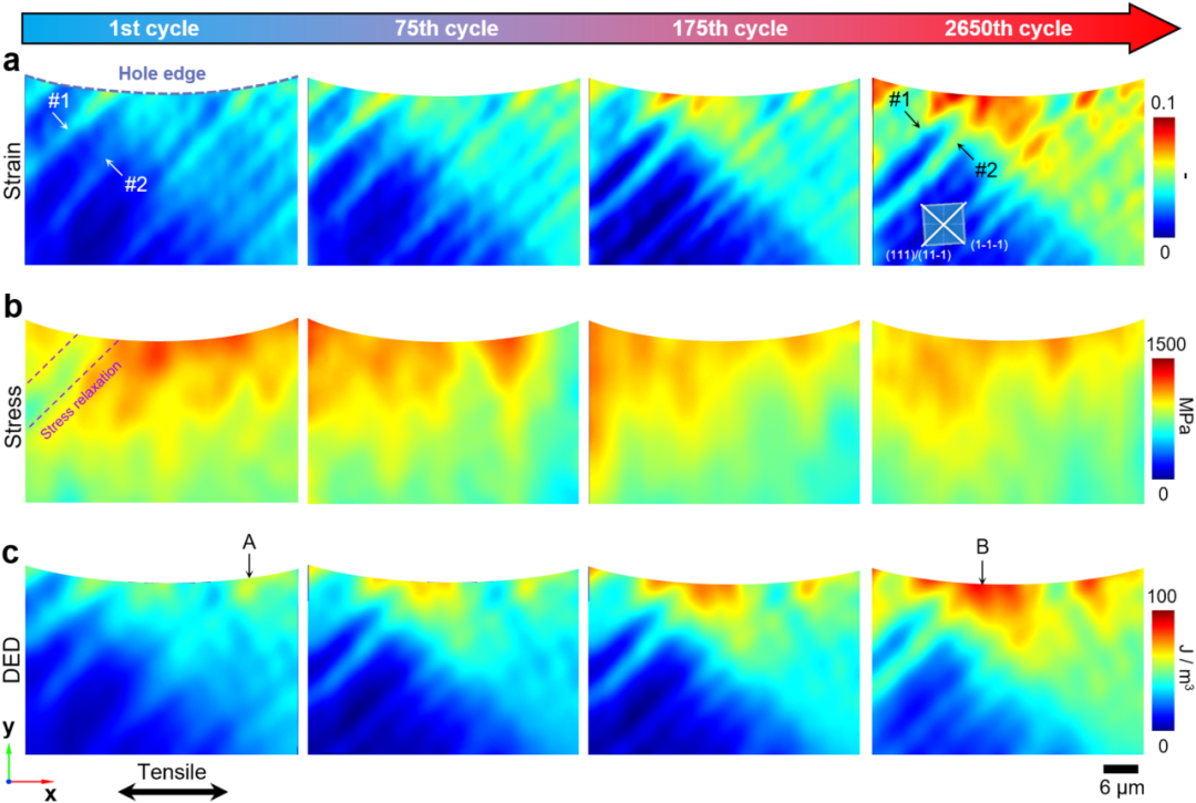 图1 低周疲劳(LCF)条件下不同循环数下:(a)最小载荷下的应变εxx集中在细小且密集分布的滑移带内;(b)最大载荷下的应力σxx集中在孔边缘处,且峰值随循环次数增加而减小,由应力松弛引起;(c)DED的热点位置与应变相似,但在考虑应力分布后,其分布更加分散