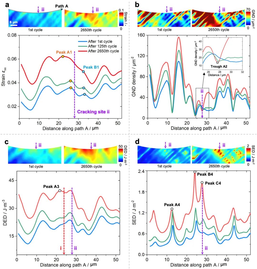 图4 试样#1在低周疲劳加载下各循环阶段的应变、GND、DED和SED分布:(a)应变分布显示,随循环增加,B1峰消失而A1峰左移;(b)GND密度分布表明,裂纹位置ii处逐渐形成新的谷值A2;(c)DED分布显示,A1峰迁移导致DED峰A3增强;(d)SED分布揭示,循环加载在裂纹位置ii产生新的SED峰值C4