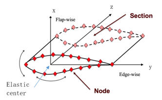 (2)在数值仿真方法方面,论文对漂浮式风机仿真软件进行了针对性的二次开发,引入基于梁单元的叶片模型求解器,实现了叶片柔性变形以及内部应力、应变响应的时域计算。在此基础上,研究在叶片表面布置了多个计算节点(图2),并建立了梁单元计算结果向叶片表面节点映射的计算方法,使得叶片整体动力响应能够细化到局部结构层面的应力与应变分布。这一处理方式有效弥合了整机仿真与局部结构分析之间的尺度差异,为后续疲劳热点识别提供了必要的力学基础。