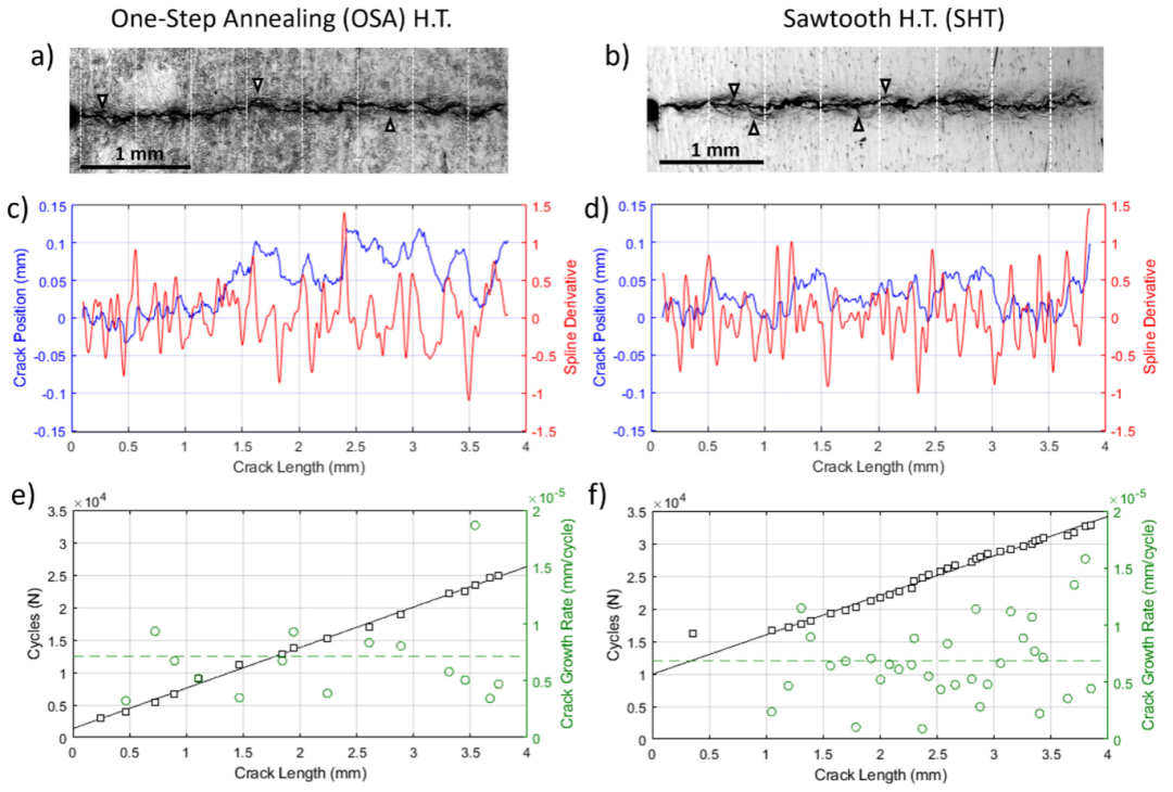 图1 观察到的名义裂纹行为概述:OSA和SHT试样的(a) 和(b) 裂纹路径的光学显微镜图像,白色箭头表示裂纹分叉的实例;(c) 和(d) 裂纹路径(蓝色)和裂纹路径的导数(红色);(e) 和(f) 疲劳裂纹长度作为加载周期(黑色)的函数线性增加,以及每条裂纹前进测量增量对应的平均裂纹扩展速率(绿色)