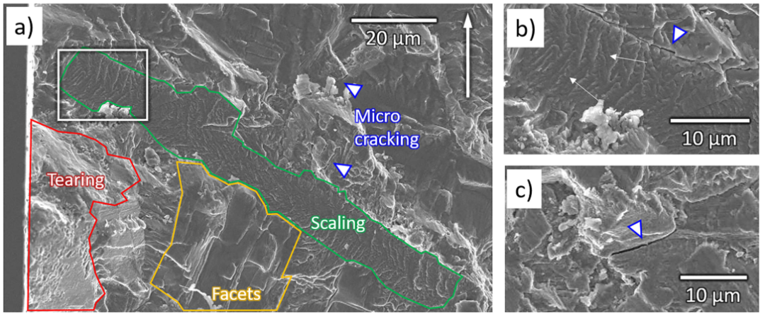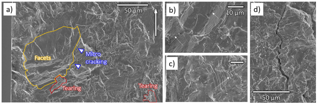 (4)断裂表面分析表明,OSA与SHT试样均呈现以解理面为主的形貌,其形成与晶粒c轴相对于加载轴的取向密切相关。主要差异在于:OSA试样解理面上频繁出现疲劳条纹(图4 (c)),对应于局部裂纹方向的频繁偏转,有助于延缓宏观扩展;而SHT试样则更多表现为鳞状特征(图5),这与层间解离导致的加速裂纹扩展相关。此外,OSA中断裂面上出现的更长微裂纹(约17.99μm)相比SHT中更短小的微裂纹(约5.48μm)能吸收更多能量,这些微观特征的差异共同导致了SHT材料疲劳寿命的降低。