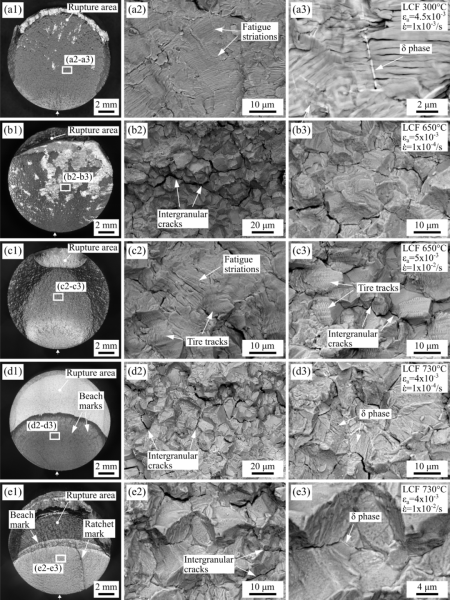 图 2 SEM断口形貌:(a1-a3) 300℃下且εa=4.5×10-3且ε=1×10-3/s;(b1-b3) 650℃下且εa=5×10-3且ε=1×10-4/s;(c1-c3) 650℃下且εa=5×10-3且ε=1×10-2/s;(d1-d3) 730℃下且εa=4×10-3且ε=1×10-4/s;(e1-e3) 730℃下且εa=4×10-3且ε=1×10-2/s
