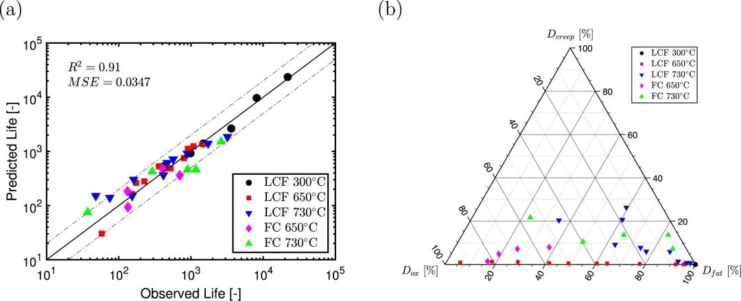 图3 (a)IN718高温合金在等温LCF和疲劳蠕变(FC)载荷下的预测与观察失效周期数;(b)三元图显示疲劳、氧化和蠕变对总损伤的相对贡献