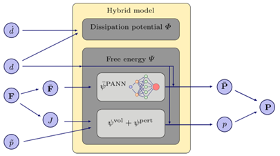 软物质(如橡胶状聚合物)的断裂模拟极具挑战性,需要精确描述材料高度非线性的本体响应(Bulk Response),并有效解决裂纹的不连续性问题。虽然相场法已成为主流的断裂模拟工具,但在处理软材料的(准)不可压特性时,若直接在断裂区域强制施加不可压约束,往往会导致体积锁定或非物理的模拟结果。此外,传统的本构模型在描述复杂软材料行为时灵活性有限。本文提出了一种混合相场断裂模型(Hybrid Phase-Field Fracture Model),核心思想是将物理增强神经网络(PANN)的高精度本构描述能力与相场法的断裂预测能力相结合,并通过改进的自由能分解框架,实现了对准不可压橡胶材料断裂行为的准确模拟。