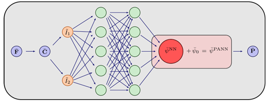 (1)提出了基于物理增强神经网络(PANN)的混合断裂模型框架。如图1所示,该模型将总自由能分解为等体(Isochoric)部分和体积(Volumetric)部分。其中,等体响应由一个满足多凸性(Polyconvexity)要求的神经网络(PANN)描述,体积响应则采用经典模型。相场法用于描述裂纹的弥散拓扑结构,并通过构建势能泛函(Pseudo-potential)推导了耦合系统的控制方程,实现了数据驱动本构与变分断裂力学的有机结合。