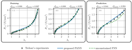 (2)构建了面向相场框架的等体PANN本构模型。为了满足热力学一致性、客观性和多凸性等物理约束,该神经网络建立在多凸等体不变量I1,I2的基础上(图2)。研究证明了该PANN能够自动满足未变形状态下的零能量和零应力条件。该架构不仅提供了极高的建模灵活性,还通过 Sobolev 训练策略,仅需少量实验数据即可精准捕捉橡胶材料的高度非线性行为(图3)。