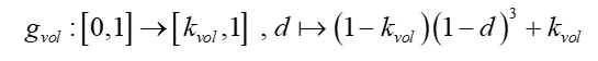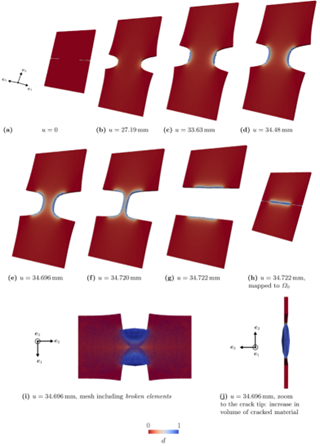 (3)实现了断裂区域不可压约束的自适应松弛。 针对准不可压材料在断裂过程中体积刚度退化的问题,模型采用了体积-等体能量分解策略,并引入了独立的体积退化函数gvol(d)(式1)。数值算例表明(图4),这种处理方式至关重要:若在断裂区维持完全的不可压约束(即gvol=1),模拟会在裂纹扩展阶段迅速失效;而引入松弛机制后,模型能够稳定地模拟出裂纹扩展直至试样完全破坏的过程。