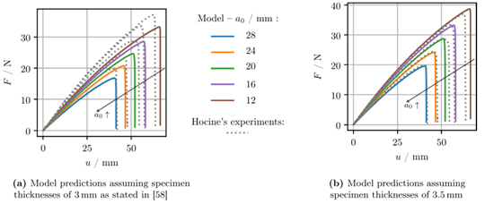(4)完成了典型橡胶断裂实验的验证与分析。利用所提出的混合模型,对双边缺口(DENT)和单边缺口(SENT)橡胶试样的断裂行为进行了模拟(图5)。结果显示,模型不仅能够重现裂纹路径的平直扩展特征,还能准确预测不同缺口长度下的力-位移响应。与 Hocine 等人的 SBR 橡胶实验数据对比(图6),在考虑了试样厚度误差修正后,模拟结果与实验高度吻合,验证了混合模型在处理复杂软材料断裂问题上的可靠性。