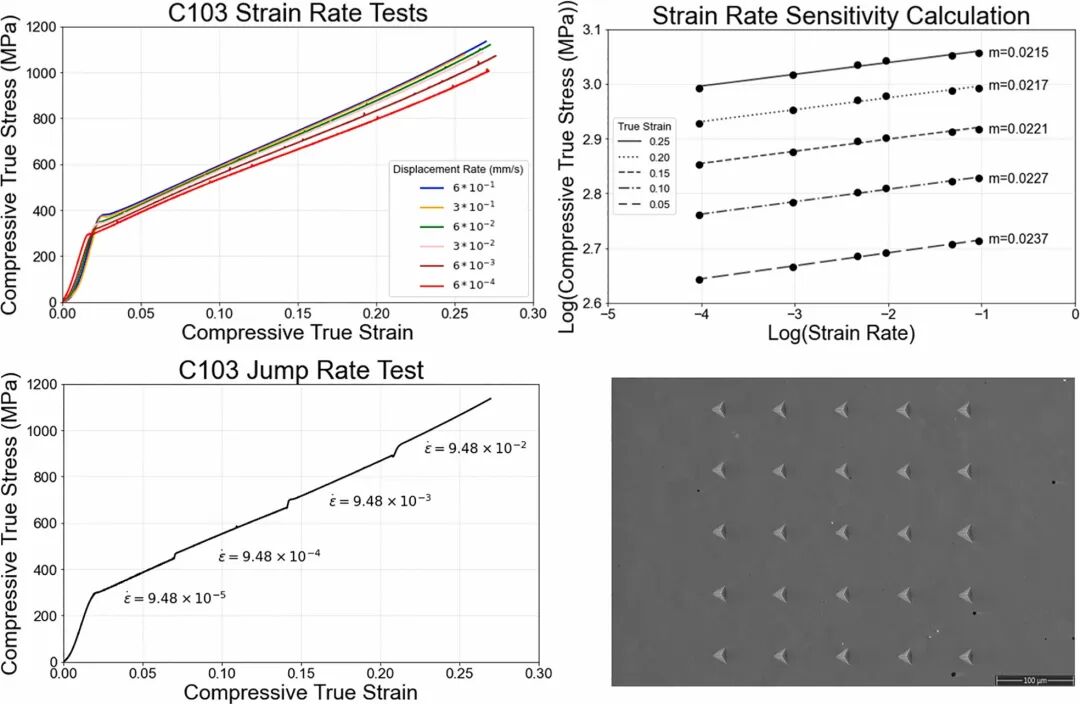 图1 不同位移速率下的压缩真应力与压缩真应变的关系图(左上),以及在不同真应变值下的对数压缩真应力与对数应变速率的关系图(右上);跳跃速率试验及其相应的应变速率图(左下),以及抛光C103材料表面的纳米压痕标记(右下)