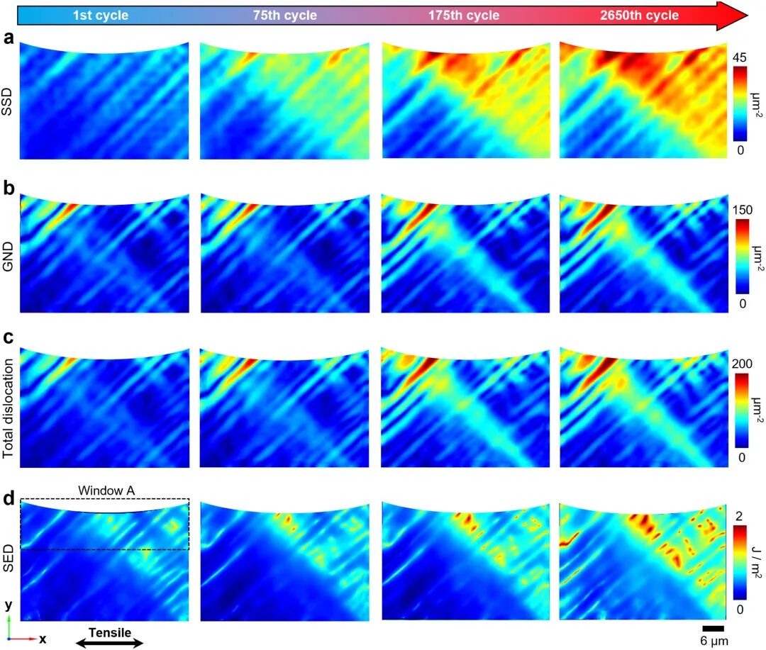 (1)基于微尺度DIC技术,本团队开发了一套新的算法,可以获取除应变场之外的应力场、位错密度(SSD/GND)场、耗散能(DED)和储能(SED)分布。图1-2揭示了由微小滑移带介导的疲劳损伤演化过程。应变局域于滑移带内,循环加载增强其应变集中但未激活新的滑移带,呈现滑移带间的竞争生长行为,导致疲劳裂纹位置偏离第一个循环的预测。早期阶段最大应变滑移带发生应力松弛,随后应力逐渐趋于均匀。DED主要集中在孔边并随循环增强,其最大值位置随应变迁移而变化。进一步分析表明,SSD分布与应变一致,GND主要集中于滑移带边界且数量级更高,主导总位错密度。相较DED,SED因引入位错密度从而分布更加局部化。