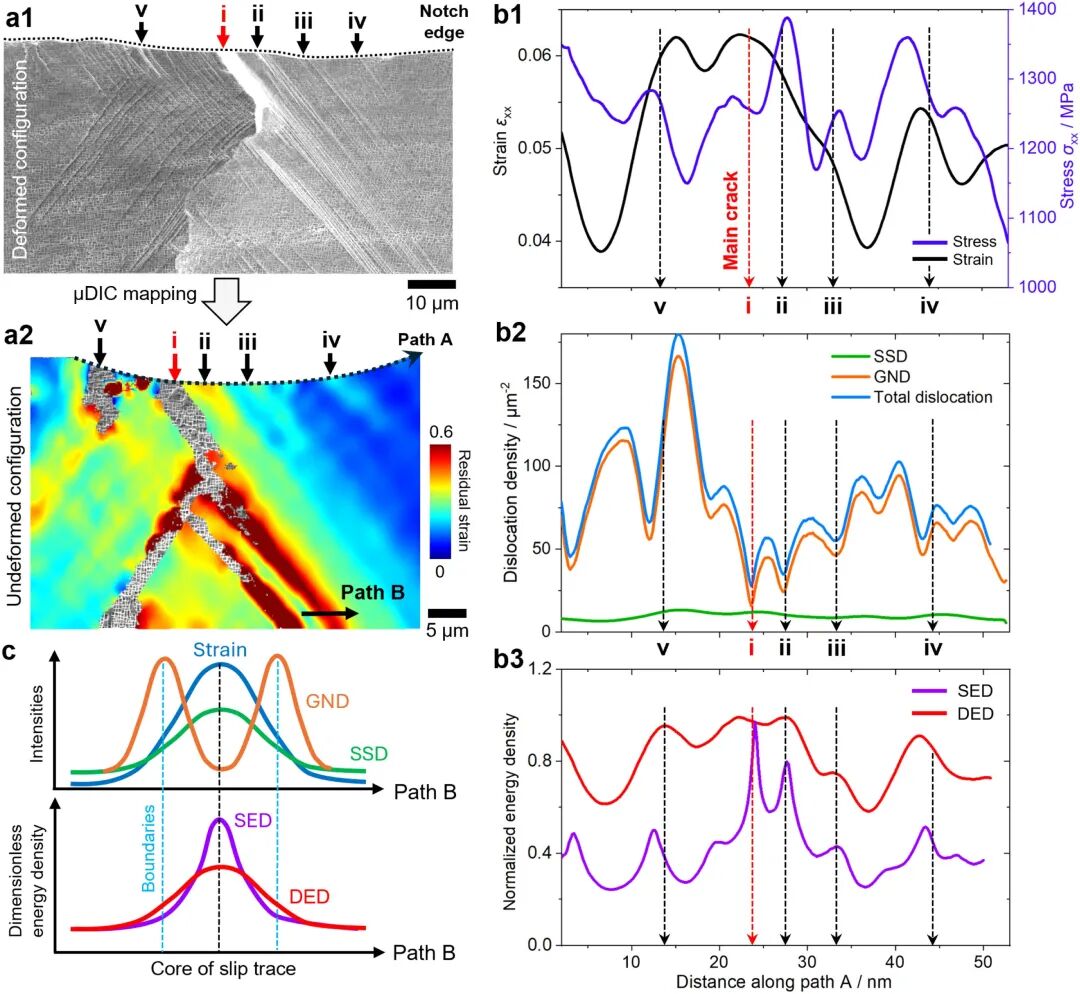 图3 基于μDIC的FIPs对低周疲劳条件下裂纹萌生预测能力的比较:(a1)疲劳断裂试样;(a2)残余应变分布,利用μDIC将裂纹位置i–iv映射至未变形状态以便精确对比。(b)裂纹位置与应力、应变、GND/SSD密度、DED和SED分布的对比,路径A定义于a2中,b1–b3共用相同横坐标,DED与SED均用峰值进行归一化。(c)示意图说明SED较DED峰值更尖锐的原因,路径B表示a2中穿过单滑移带的路径。