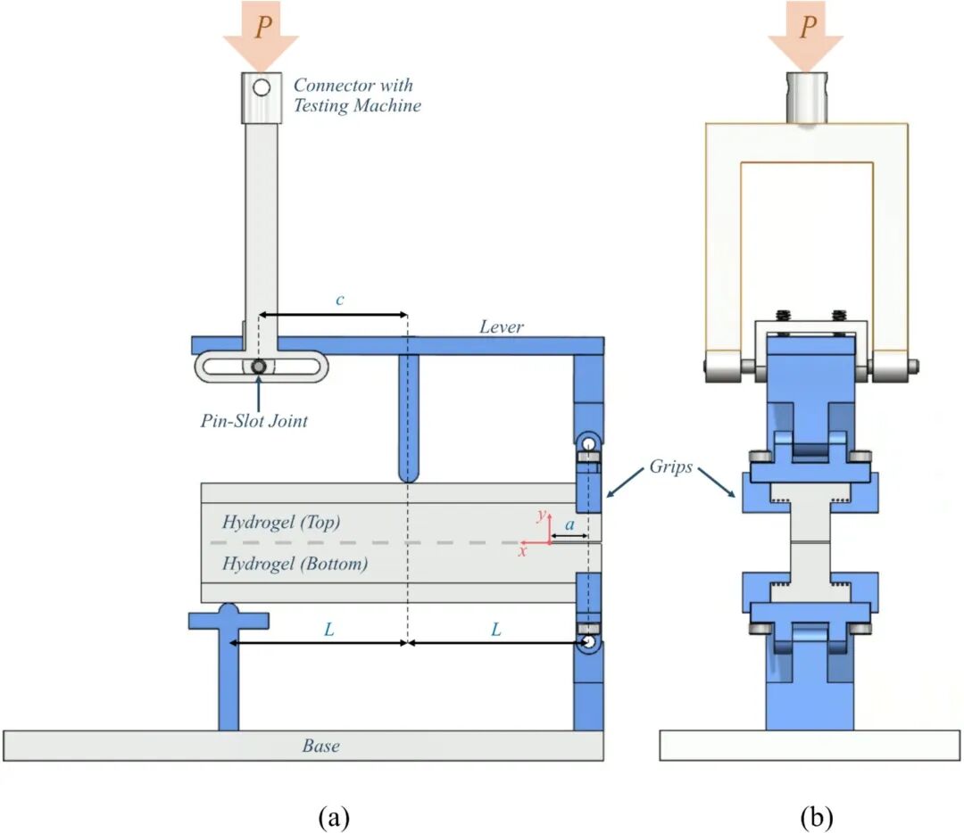 水凝胶是一种富含水的三维聚合物网络,因其独特的生物相容性、可调的物理化学性质以及与生物软组织相似的力学性能,在生物医学领域展现出巨大的应用潜力,例如作为伤口敷料、药物递送载体、组织工程支架以及可穿戴电子设备的基体等。在许多此类应用中,水凝胶需要与生物组织或其他水凝胶材料实现牢固、可靠的粘合。因此,水凝胶界面粘附的强度和韧性成为决定其应用成败的关键力学性能指标。目前,评估软材料界面粘附强度最常用的方法是剥离测试(如90°或180°剥离测试)。然而,这类方法存在一个根本性的局限:所测得的“韧性”是界面真实断裂能与水凝胶基体在剥离过程中发生大变形所耗散能量的总和。对于水凝胶这类极易变形的软材料而言,基体耗散的能量往往远大于界面本征的断裂能,从而导致对界面韧性的严重高估。因此,开发能够直接、准确测量软-软界面本征断裂韧性的实验方法,是当前软材料力学领域一个亟待解决的重要挑战。