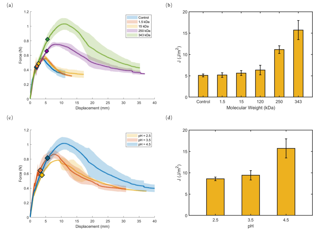 图3(a)控制组与施加不同分子量壳聚糖溶液试样的载荷-位移曲线(实线表示平均值,阴影区域表示95%置信区间),菱形标记点指示典型裂纹萌生位置,菱形标记指示典型的裂纹萌生;(b)对照组及涂覆不同分子量壳聚糖溶液试样的J-积分断裂萌生韧性值;(c)在三个不同pH值下,涂覆375 kDa壳聚糖溶液的水凝胶试样的力-位移曲线;(d)在三个不同pH值下,涂覆375 kDa壳聚糖溶液试样的J-积分断裂萌生韧性值