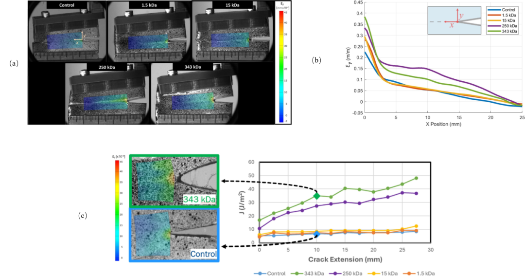 (3)利用数字图像相关技术对裂纹尖端应变场进行原位分析,揭示了韧性增强的微观机制。对于I型加载,在高分子量壳聚糖样本中,裂纹尖端出现明显的钝化现象,导致张开应变显著增大和应力集中缓解,需要更多能量才能驱动裂纹扩展。而在对照组和低分子量样本中,裂纹尖端保持尖锐。(图4)对于混合型加载,裂纹尖端钝化现象消失。剪切应变沿界面分布,而非集中在尖端,表明剪切应力更容易破坏壳聚糖缝合网络。这解释了为何混合模式下的韧性始终低于纯I型加载(图5)。