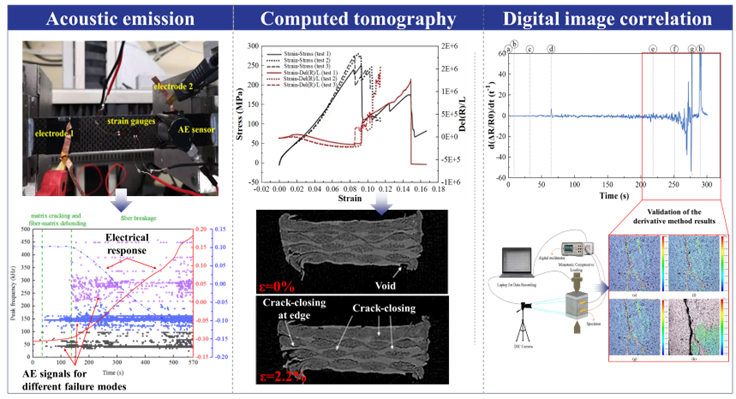 3)可靠的第三方交叉验证:文章强调,必须通过第三方技术来校准电信号与物理损伤的真实对应关系。本研究总结了三种最有效的原位验证技术:①声发射 (AE)通过捕捉裂纹释放的弹性波,可与电阻突变信号进行高精度时间同步,共同验证动态损伤事件(如纤维或基体开裂);②X射线计算机断层扫描 (CT)通过三维可视化方式为电阻曲线的拐点提供内部微裂纹的直接证据;③数字图像相关法 (DIC)通过追踪表面应变场,可高精度验证表面裂纹扩展与电阻变化的关联,适用于验证水泥基材料或复合材料表面裂纹导致的电阻变化。