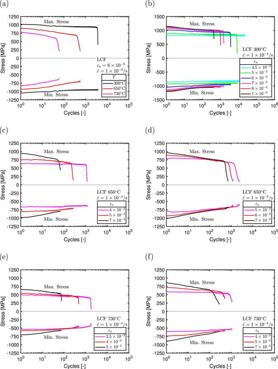 图1 在不同试验温度下的低周疲劳加载过程中,最小与最大应力随循环周次的演变规律如图(a)所示;其中图(b)展示了300℃条件下的低周疲劳载荷响应;图(c)和(d)分别呈现了650℃时采用1×10-4/s与1×10-2/s机械应变速率加载的对比结果;图(e)和(f)则对应730℃条件下采用1×10-4/s与1×10-2/s机械应变速率的疲劳载荷演化特征