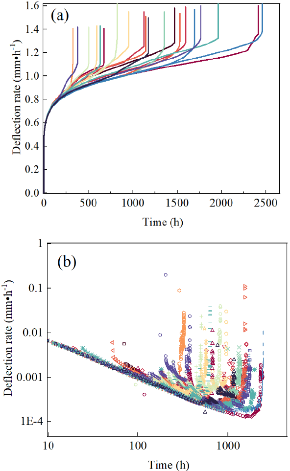 (3)小冲杆蠕变测试(SPCT)的分散性预测与验证:利用概率蠕变损伤模型对P91钢在600℃/240N条件下的SPCT进行了20次随机模拟。图3显示了模拟得到的挠度-时间曲线和挠度速率曲线,复现了蠕变断裂时间的显著分散性。