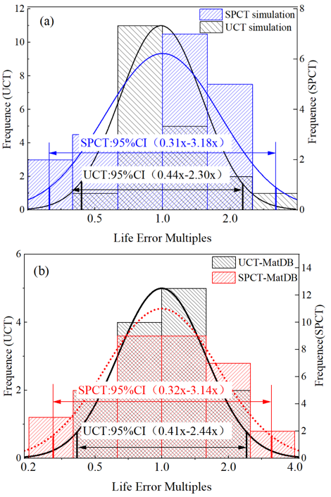图7是本研究的核心对比结果。直方图统计表明,无论是实验数据还是模拟结果,SPCT的寿命置信区间宽度约为UCT的1.3倍(实验值为1.29倍,模拟预测值为1.38倍)。这说明模型成功复现了由试样尺寸效应(SPCT体积小,微观随机性难被平均化)和应力状态(SPCT为复杂多轴应力)导致的系统性分散差异。